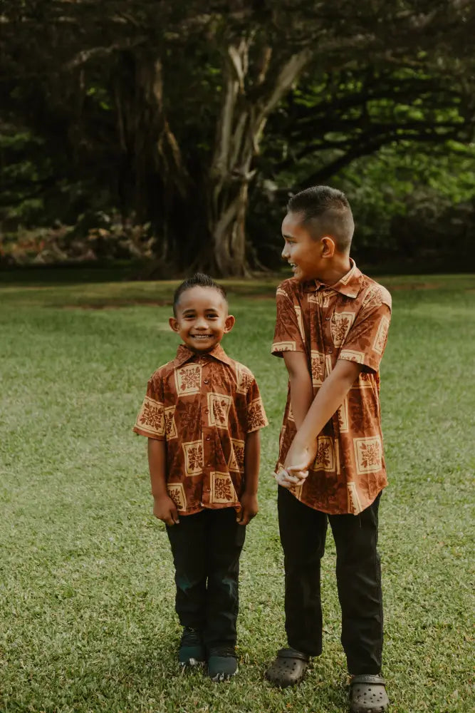 NOEAU DESIGNERS - Kalo Quilt Brown Keiki Aloha Shirt