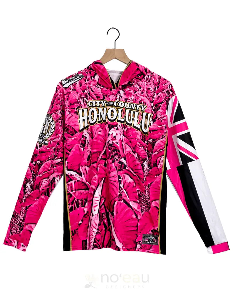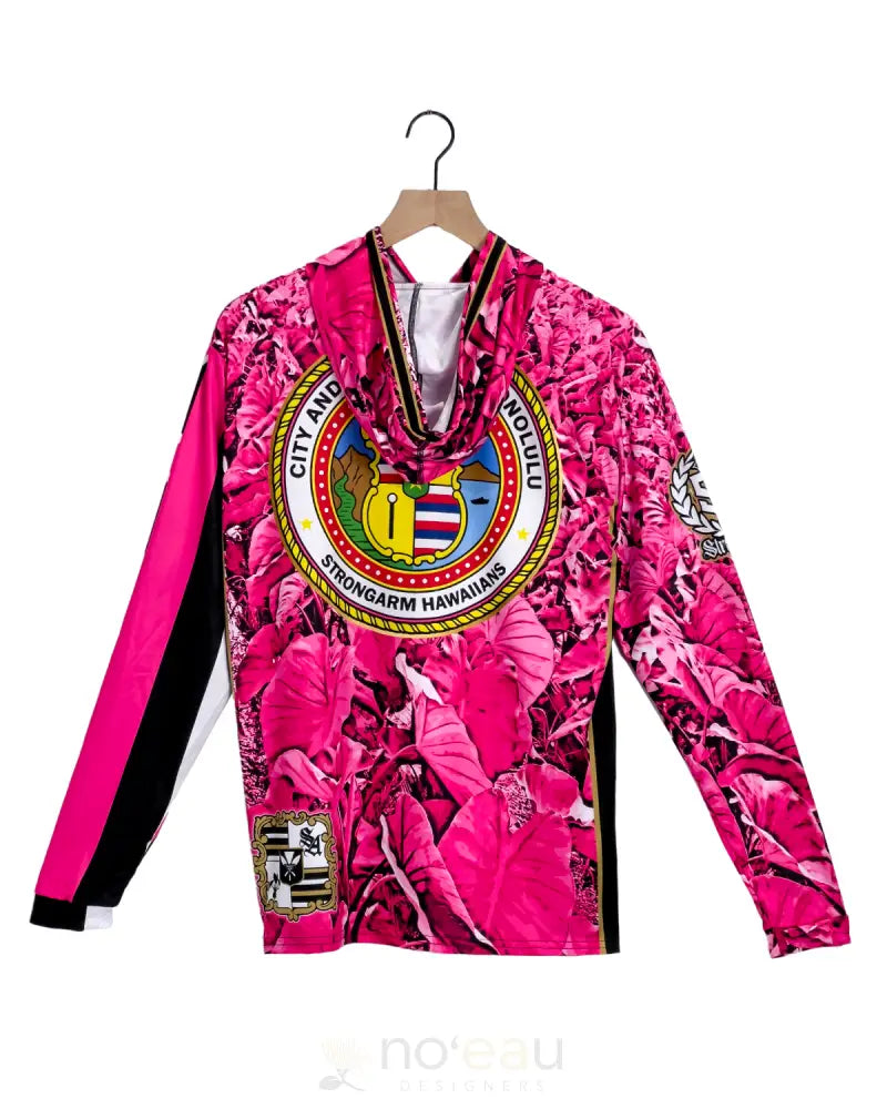 Embrace your island heritage with this striking long sleeve hoodie from STRONGARN HAWAIIANS. Featuring a vibrant 'akala (pink) kalo (taro) sublimation dye design, this piece celebrates Hawaiian culture with authentic artistry. The comfortable hood and durable construction make it perfect for layering on cooler days while staying connected to your roots. A meaningful way to represent the City and County of Honolulu with pride and style.