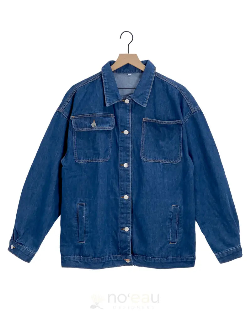 Inspired by the legend of Kaiona, the benevolent goddess of Mount Kaʻala who guides the lost with her Iwa, this vintage-style denim jacket blends timeless craftsmanship with practical design. Featuring a vintage-washed finish that gives it authentic character, this jacket layers beautifully over any outfit. Whether you're dressing up or keeping it casual, this versatile piece supports your personal style with enduring quality and charm.
