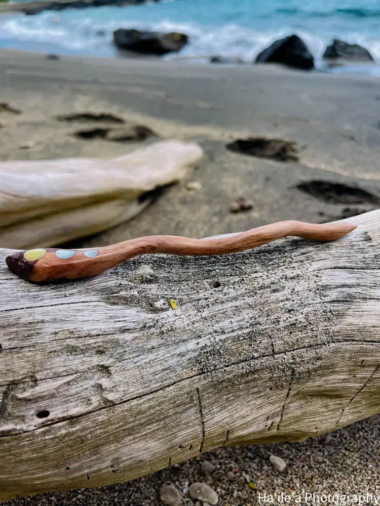 Our E OLA ANA Kopiko hair stick, with its luxurious Mother of Pearl embellishment, will bring a touch of Hawaii's natural beauty to your hair. Crafted from the finest wood, this exquisite accessory is sure to please even the most discerning fashionista. Bring a piece of the islands home with you.